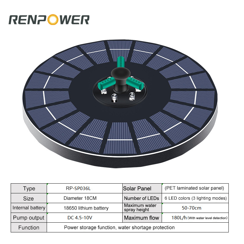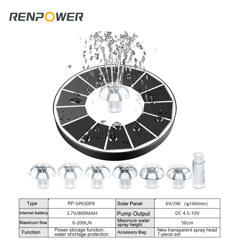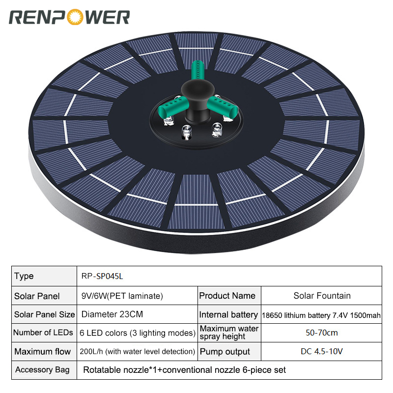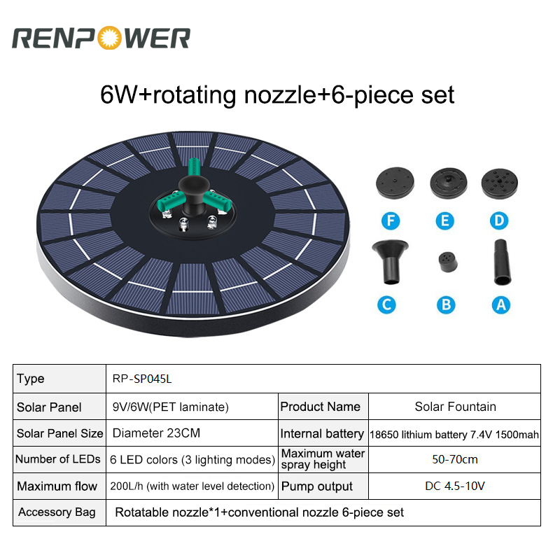 Слънчева градина миниатюра 1.5W DC Fountain Pump Solar Miniature Landscape Foundain Pool Decoration Pump PumpСлънчевият фонтан е ландшафтен фонтан, който използва слънчева енергия за управление на водна помпа за изпомпване на вода. Този продукт използва високоефективни слънчеви панели и нова безчетка водна помпа, която има предимствата на бързото стартиране, високата ефективност и силната стабилност. В допълнение, продуктът не изисква външно захранване. Той е не само лесен за инсталиране и работа, но и безопасен, надежден, енергоспестяващ и екологичен. Продуктът се използва широко на места като фонтани за басейн, риболовни фонтани и циркулация на вода за риба.